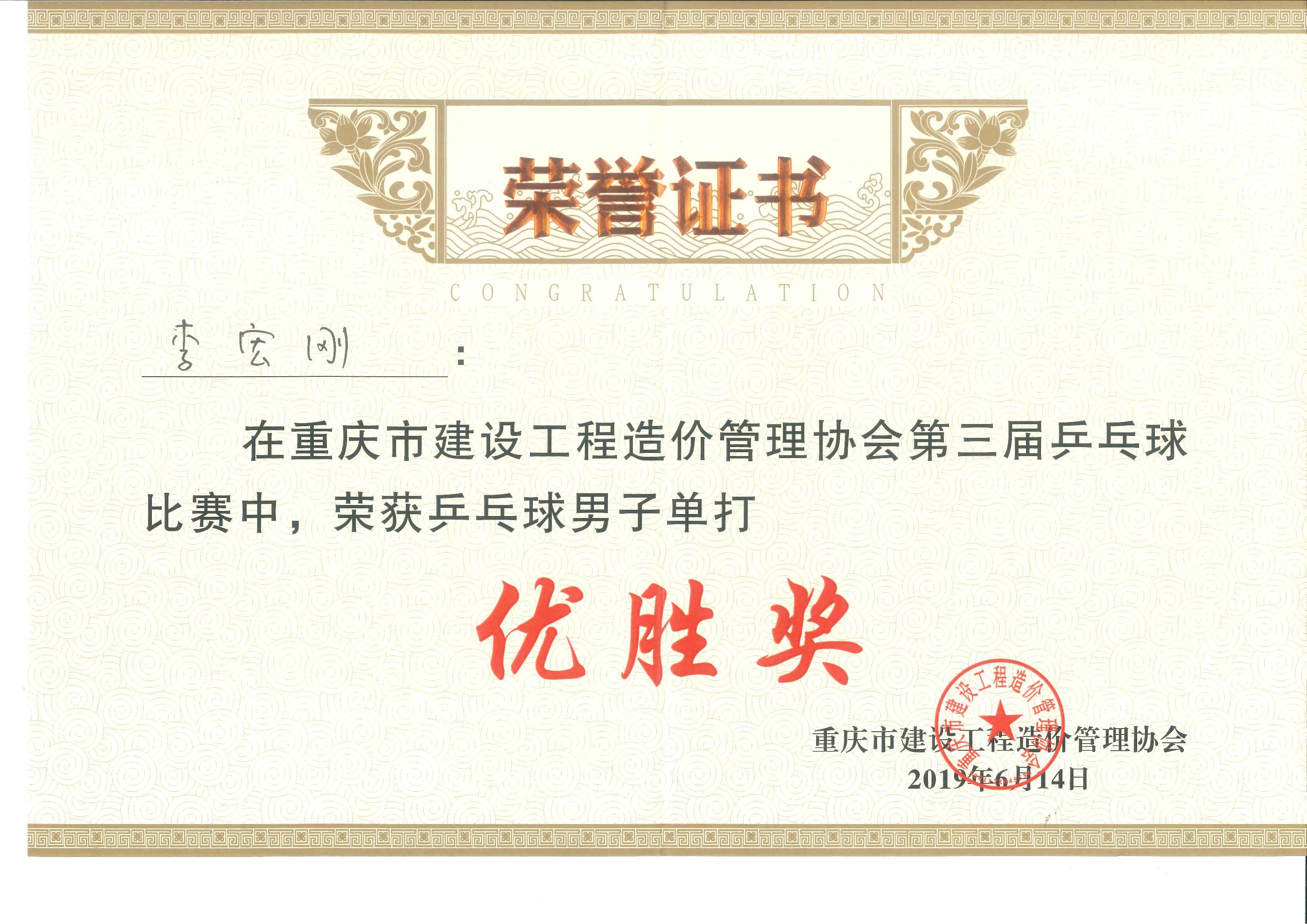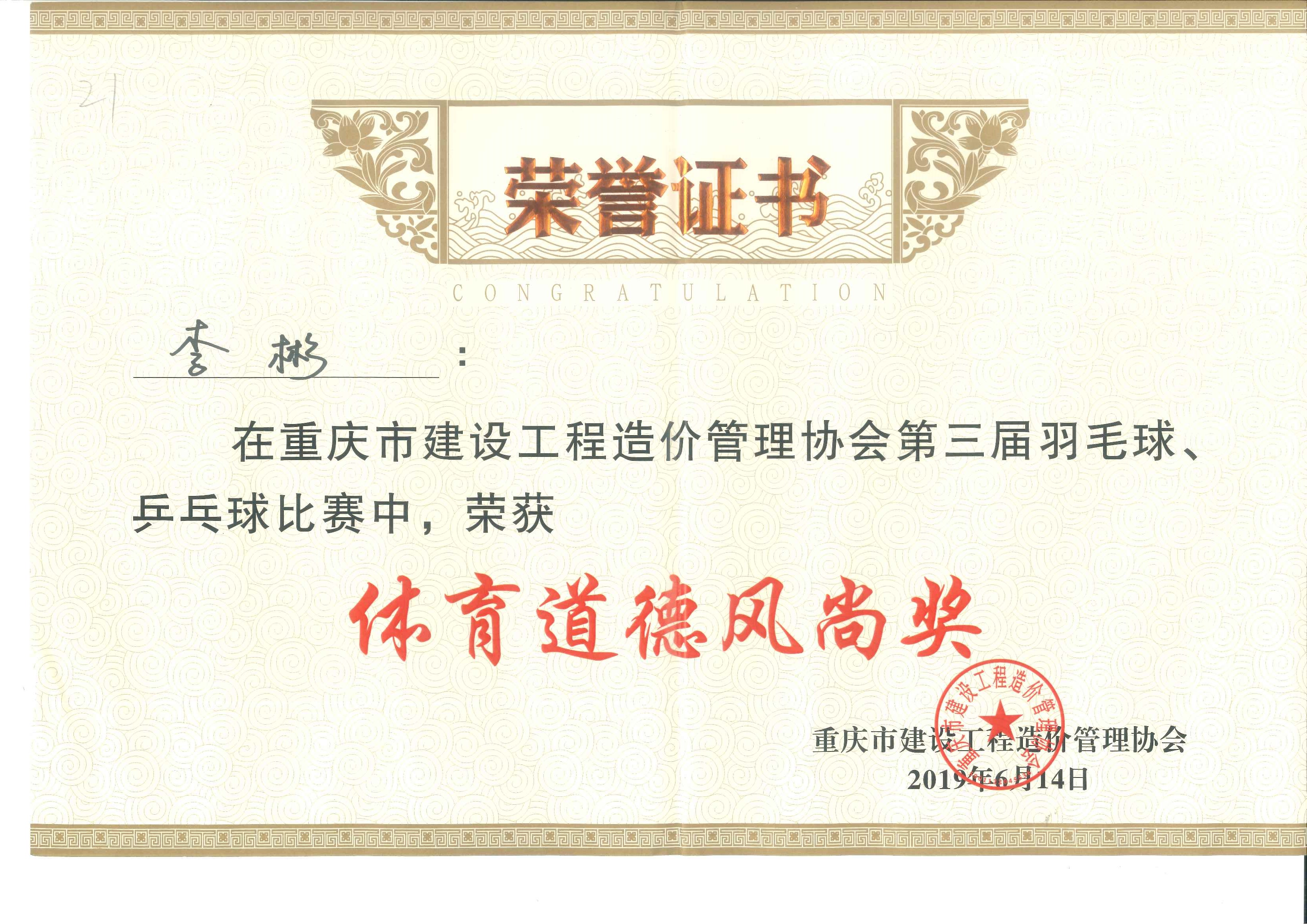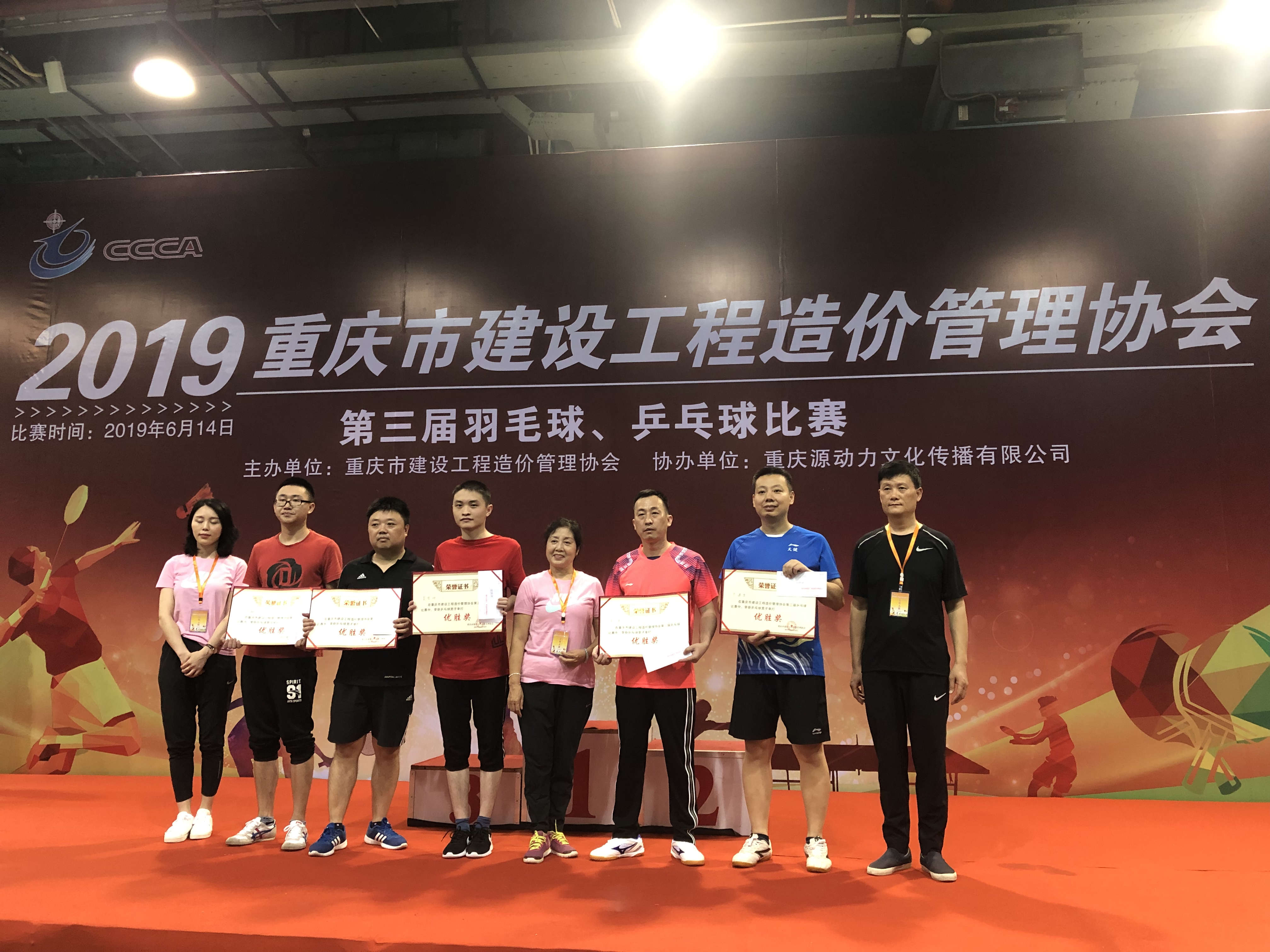 ——記重慶市建設工程造價管理協會第三屆羽毛球、乒乓球比賽 重慶市建設工程造價管理協會舉辦的第三屆羽毛球、乒乓球比賽于2019年6月14日在大田灣體育場隆重舉行。此次賽事得到了廣大會員單位的熱情響應和積極支持,共83支隊伍近300名選手參加了本次比賽。 重慶宏達招標代理有限公司員工參賽熱情高漲,積極報名參加,公司為這次活動提供了優越的后勤保障,啦啦隊全程為參賽選手加油鼓勁,表現了良好的拼搏進取和團結協作的精神。 公司的五名參賽選手分別參加了羽毛球男子單打、羽毛球男女混雙、乒乓球男單、乒乓球女單等四個項目的比賽。宏達公司在比賽中積極發揚了“友誼第一、比賽第二、重在參與”的良好體育道德精神。最終取得了不俗成績:李宏剛斬獲乒乓球男單第四名;李彬榮獲體育道德風尚獎。 本次比賽展示了我公司齊心合力、眾志成城、勇攀高峰的團隊合作力量;展現了造價行業人員之間積極進取、拼搏向上、勇于開拓的精神。增強了我市造價行業人員之間的凝聚力及和諧氛圍。