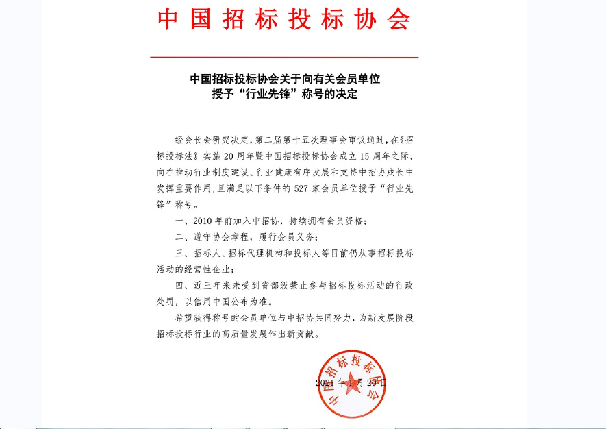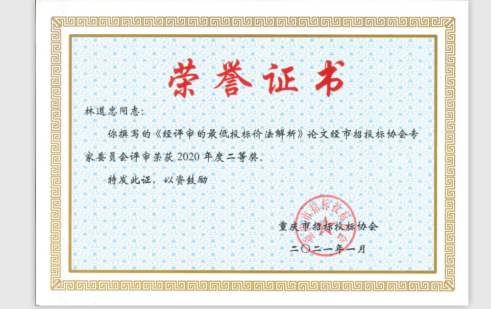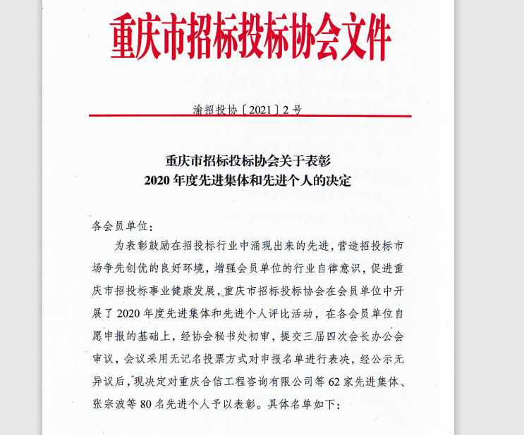 金牛盈門,萬象俱新。走過2020,我們不留遺憾,來到2021,欣宏達繼續奮發昂揚。新年一月,正是揚帆遠眺,宏圖待興之時,重慶欣宏達項目管理有限公司捷報頻傳! 2021年1月20日,中國招標投標協會“2020年招標投標行業發布會”在線召開。會上,任瓏會長宣讀了“關于向有關會員單位授予‘行業先鋒’稱號的決定”。重慶欣宏達項目管理有限公司獲得“行業先鋒”稱號,對我公司長期以來推動行業制度建設、行業健康有序發展和支持中國招標投標協會成長中發揮重要作用給予高度肯定。 2021年1月18日,重慶市招標投標協會發布了《重慶市招標投標協會關于表彰2020年度先進集體和先進個人的決定》,重慶欣宏達項目管理有限公司及公司招采六部主任李亮廷分別獲得“先進集體”與“先進個人”表彰,為公司大廳的榮譽墻上再添兩枚獎章。 花開兩朵,平添喜訊。近日,重慶市招標投標協會發布了《關于對2020年度獲獎論文的通報》,由我公司總工程師林道忠執筆的課題論文《經評審的最低投標價法解析》榮獲二等獎。 以上榮譽既是各界對欣宏達公司的認同和肯定,但也滿懷著對我們未來的更大期望。我們堅信,欣宏達終將不負眾望,保持良好發展勢頭,繼續前行,在未來斬獲更多的榮譽、創造更加輝煌的成績!