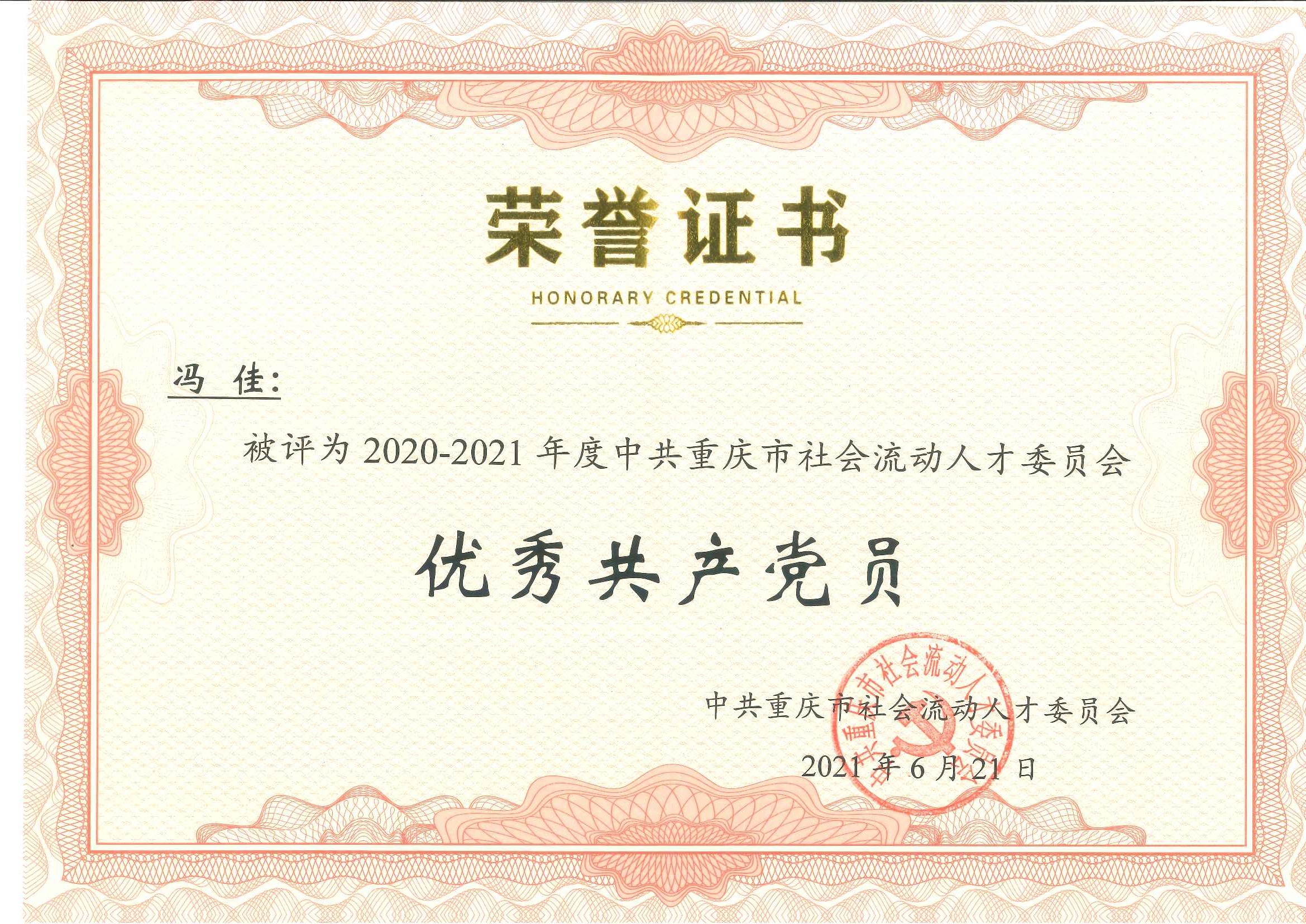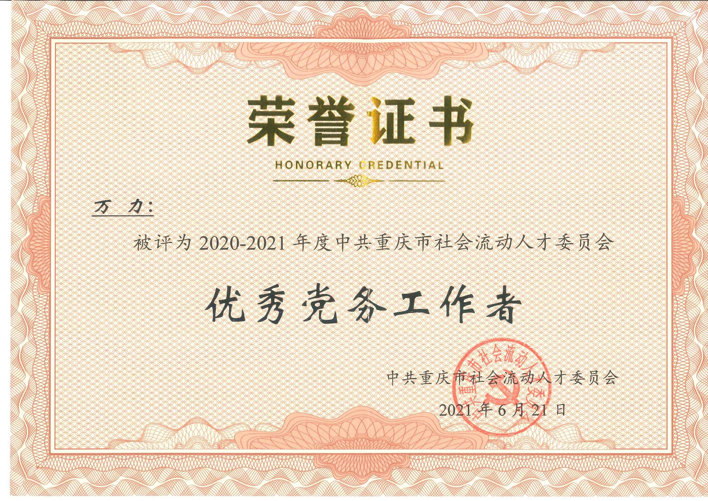 在中國共產黨成立100周年之際,為表彰先進、弘揚正氣、樹立標桿、鼓舞斗志,激勵各級黨組織和廣大共產黨員不忘初心、牢記使命,擔當作為,6月26日上午,中共重慶市社會流動黨委召開“慶祝中國共產黨成立100周年暨中共重慶市社會流動人才委員會2020-2021表彰大會”。中共重慶社會流動人才黨委第二總支第2支部欣宏達小組萬力同志榮獲優秀黨務工作者,馮佳同志榮獲優秀共產黨員。