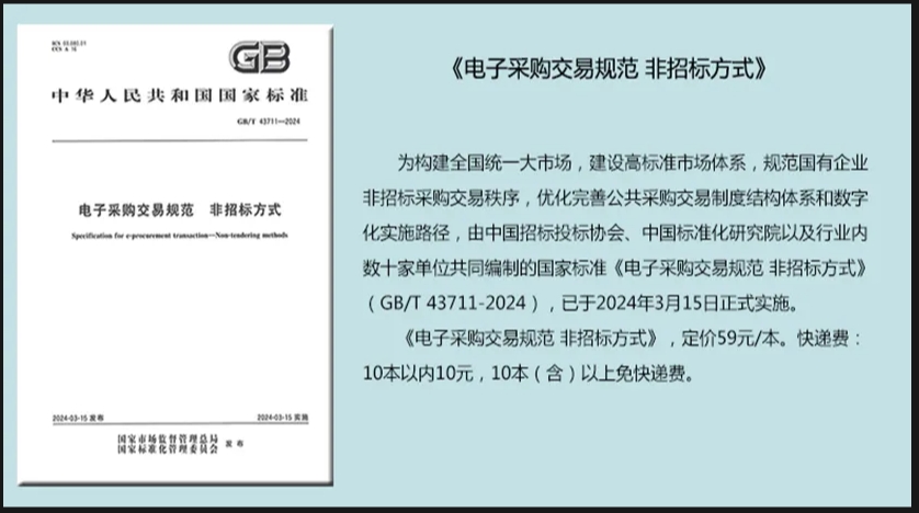 ![]() 據(jù)悉,《電子采購(gòu)交易規(guī)范 非招標(biāo)方式》(以下簡(jiǎn)稱(chēng)標(biāo)準(zhǔn))是在國(guó)家發(fā)改委、國(guó)資委、住建部、國(guó)家能源局、審計(jì)署等多個(gè)部委的聯(lián)合指導(dǎo)下,經(jīng)過(guò)中國(guó)招標(biāo)投標(biāo)協(xié)會(huì)和中國(guó)標(biāo)準(zhǔn)化研究院,以及多位行業(yè)專(zhuān)家的共同努力,歷時(shí)三年精心編制而成的。這一標(biāo)準(zhǔn)不僅填補(bǔ)了我國(guó)在國(guó)有企業(yè)采購(gòu)制度規(guī)范領(lǐng)域的空白,更是首部適用于國(guó)有企業(yè)及其它企事業(yè)單位主體非招標(biāo)項(xiàng)目的全國(guó)統(tǒng)一采購(gòu)交易國(guó)家標(biāo)準(zhǔn)。